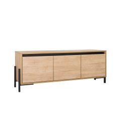 Минималистичный современный дизайн тумбы дополняют металлические опоры в стиле лофт. Анодированный алюминиевый профиль служит конструктивным и декоративным элементом, надежной фурнитурой при эксплуатации. Новый декор ЛДСП наделен естественным тиснением и максимально приближен к натуральной древесине. Корпус выполнен из плиты с увеличенной толщиной ЛДСП 18 мм с кромкой 1 мм. Такой материал готов к повышенным нагрузкам, а толстая кромка делает тумбу более устойчивой перед негативными факторами внешней среды. В столешнице имеется вырез под провода для подключения мультимедиа техники.