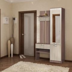 Прихожая имеет простой дизайн и прямые формы. Она состоит из вешалки с тумбой и пенала. Открытая вешалка оборудована полкой для головных уборов, тремя 3-х рожковыми крючками для одежды, ниже выдвижной ящик на роликовых направляющих, под ним открытая ниша с полкой. За распашными дверьми пенала три полки. Тип сборки и направление открытия дверей определеяется при сборке.